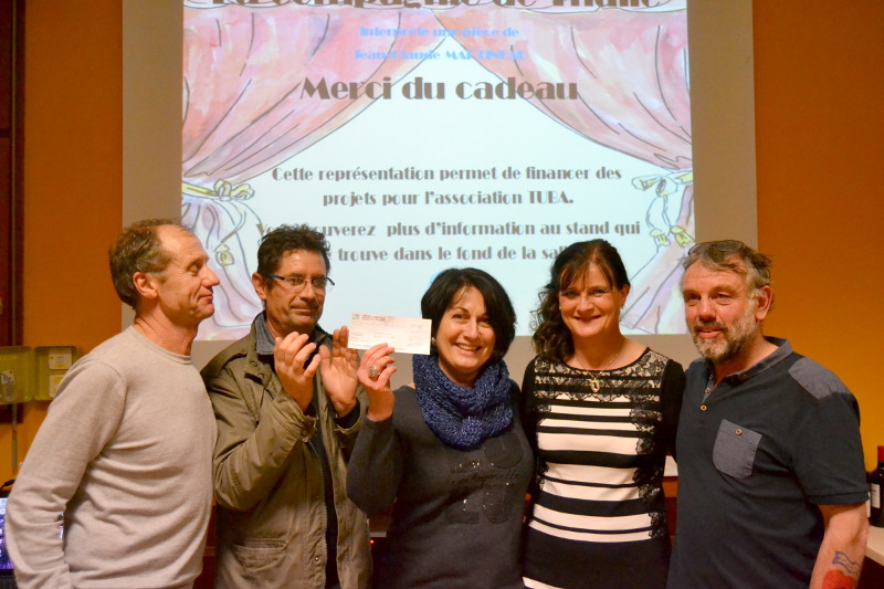 1173 entrées payantes ont été comptabilisées pour les représentations de « Merci du cadeau ». C’est pourquoi un chèque de 1173 € a été remis le 8 février 2015 à la Présidente de l’association TUBA – Trait d’Union Bol d’Air